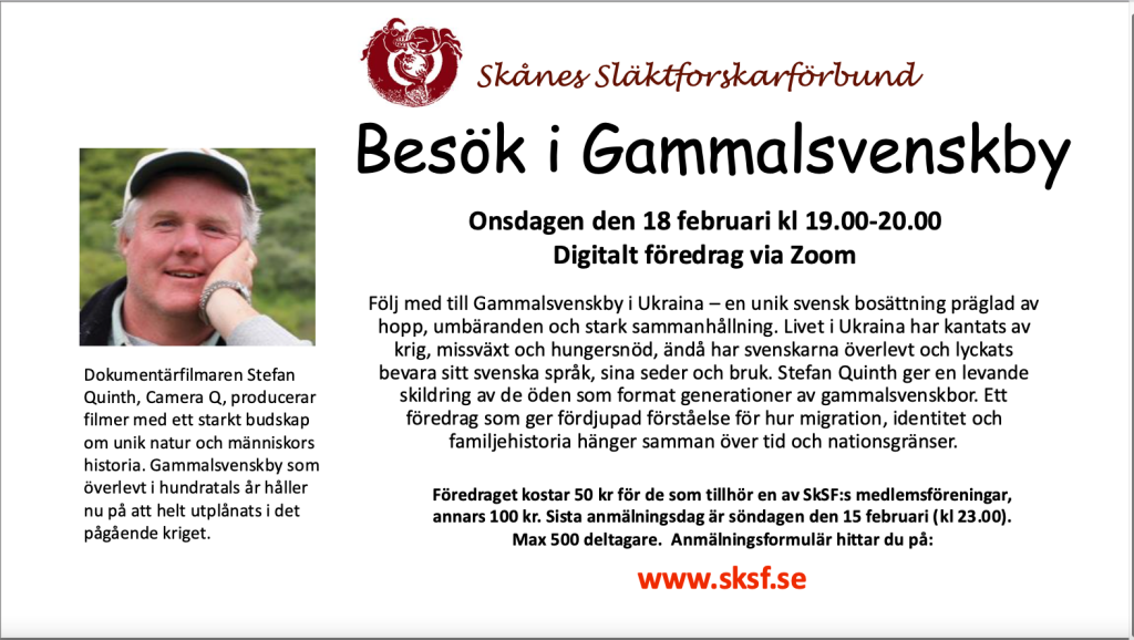 - Handboken Släktforska i Malmö – Anette Sarnäs, kl 11:30.