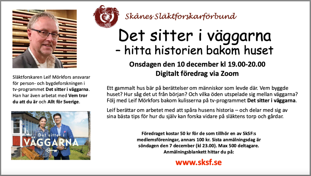 Höstens föreläsningsserie i Skånes Släktforskarförbunds regi avslutas onsdag den 10 december 2025 med ett föredrag av Leif Mörkfors, känd från media. Leif tar med oss på en spännande resa bakom kulisserna till det välkända tv-programmet ”Det sitter i väggarna”.